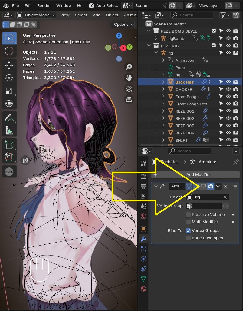 Complete body and face rig of Reze from Chainsaw Man made with a custom Rigify Rig.